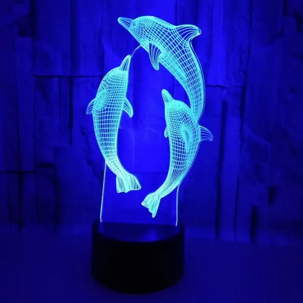 Rigtig flot og sød delfin 3D lampe med 3 flotte delfiner. Farveskift mellem 7 farver.