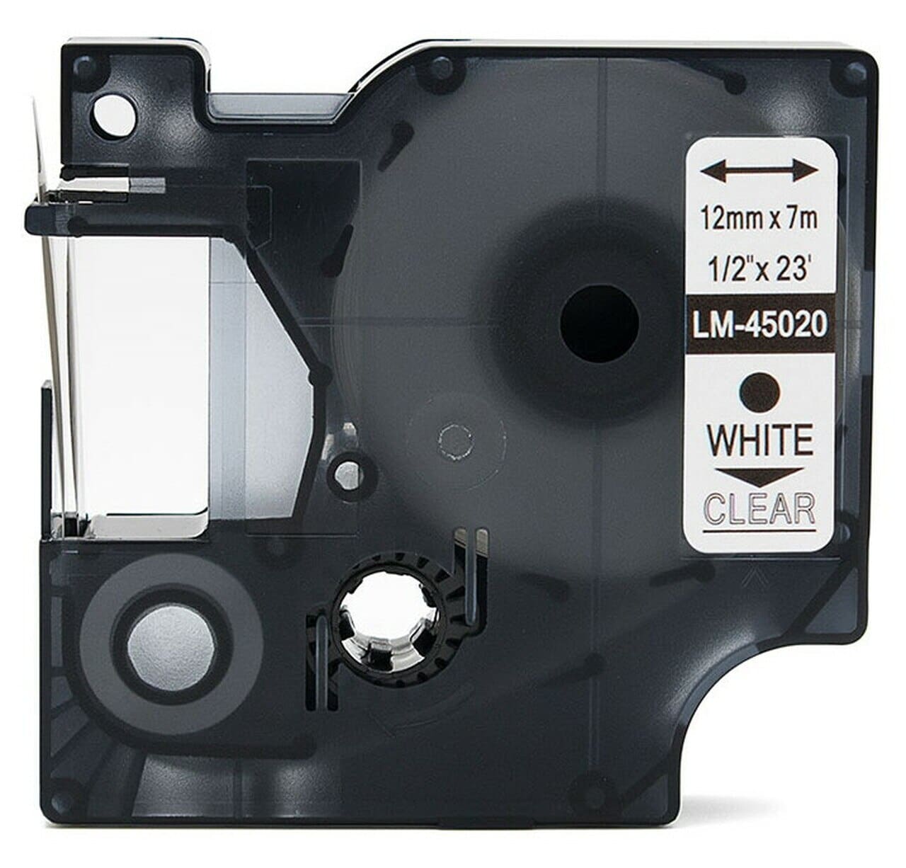 Dymo 45020 D1 hvid på transparent tape – Kompatibel S0720600 – 12mm x 7m passer til: Dymo Labelmaker 4500 | Dymo Labelmaker PC 10 | LabelMANAGER 100P | LabelMANAGER 120P | LabelMANAGER 150 | LabelMANAGER 160 | LabelMANAGER 200 | LabelMANAGER 210D | LabelM