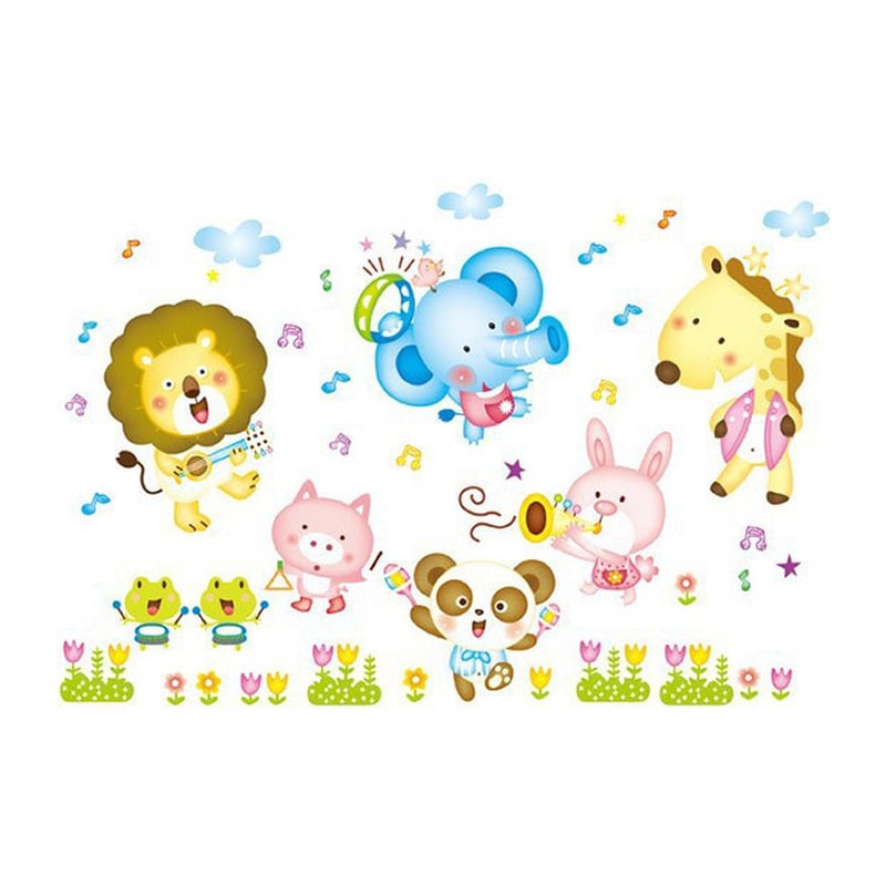 Sjov, flot og farverig wallsticker med et helt band af søde dyr der spiller musik, – med bla elefant, giraf, panda, kanin og løve
