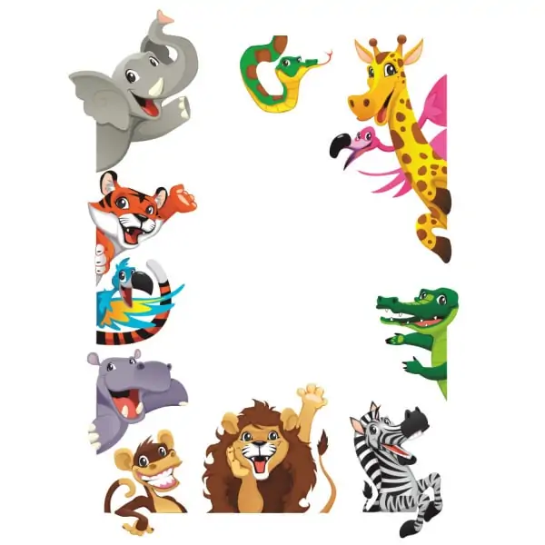 Rigtig flot og sød wallsticker med masser af dyr, der kigger frem. Løve, tiger, papegøje, flodhest, elefant, zebra, krokodille, abe, giraf og flamingo.