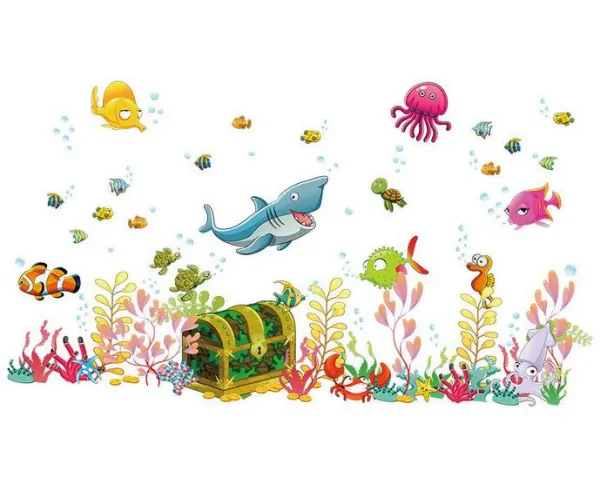 Flot og sød wallsticker med en skattekiste på havets bund, omgivet af farverige og eksotiske fisk, blæksprutter, hajer mm.