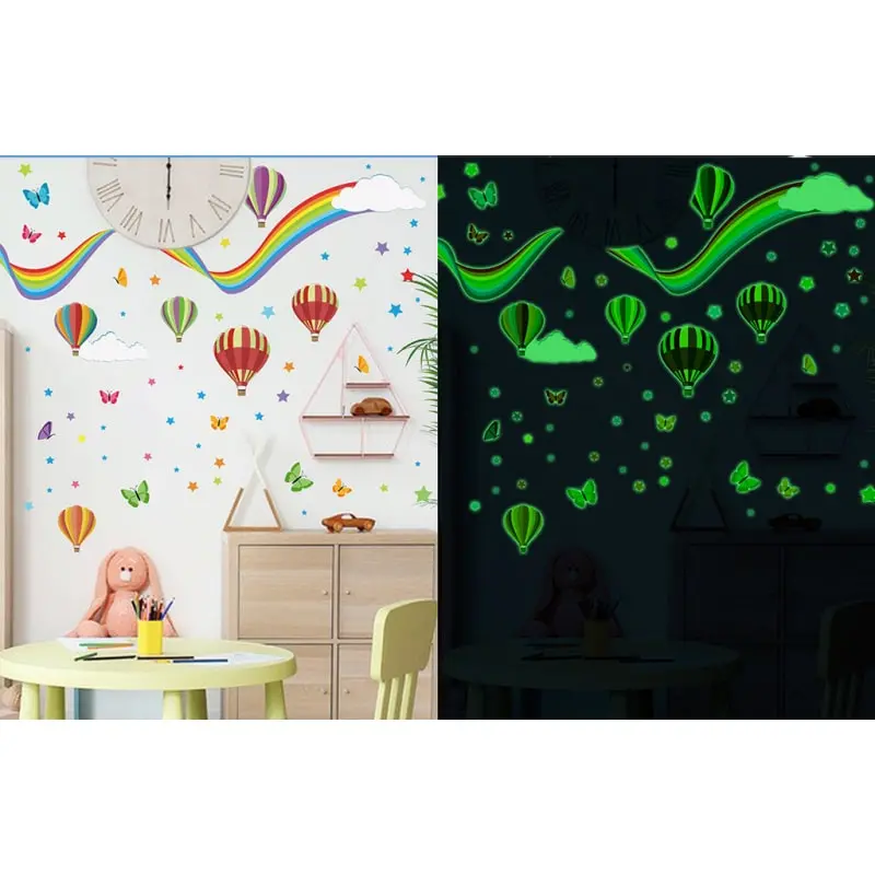 Flot selvlysende wallsticker med en regnbue, luftballoner, sommerfugle og stjerner.