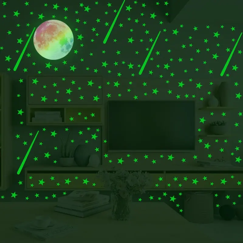 Selvlysende wallsticker med meteor regn. Måne, meteorer og masser af stjerner. 474 stk.