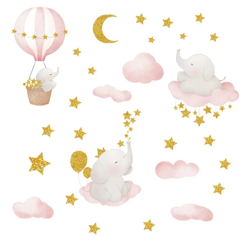 Rigtig flot wallsticker med søde elefanter der svæver på skyerne.