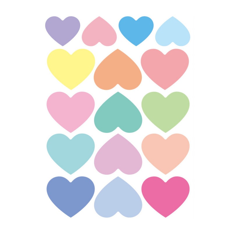Flot hjerte wallsticker med 16 stk farverige hjerter i forskellige størrelser.