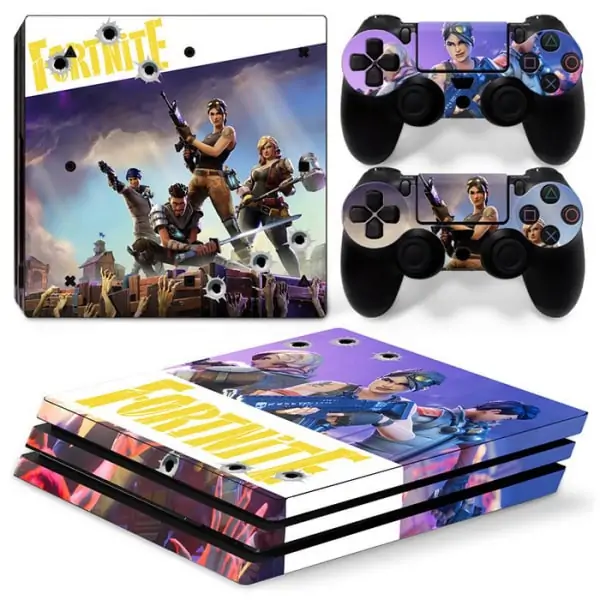 Fortnite PS4 Pro skin, gennemhullet af skud, med alle Fortnite heltene prydende for- og bagsiden samt siderne på din PlayStation 4 Pro.