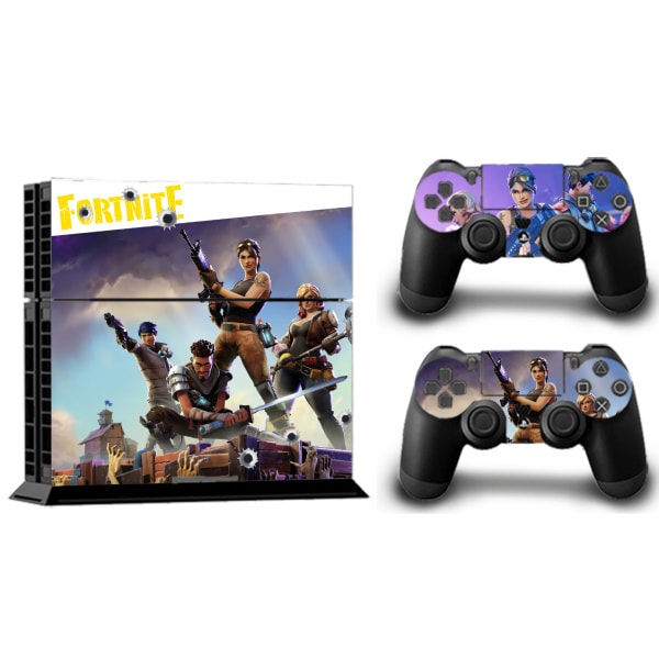 Rigtig sejt Fortnite PS4 skin, gennemhullet af skud, med alle Fortnite heltene prydende for- og bagsiden samt siderne på din PlayStation 4.