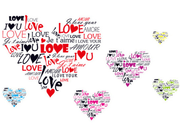 Farverig, flot og kreativ wallsticker med 6 hjerter formet af masser af ‘love’ og kærlighed.
