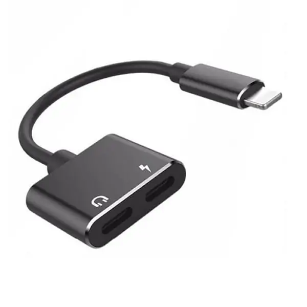 iPhone Lightning splitter. Dual opladning og earphone adapter. Sort.