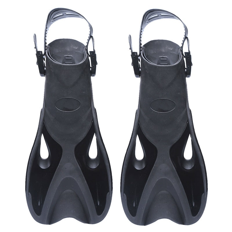 Justerbare svømmefødder med åben hælrem og kort finne i størrelse 42-45 i sort.