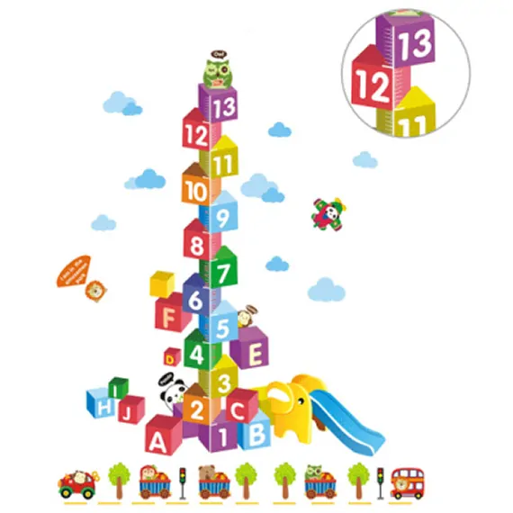 Sjov, lærerig og funktionel wallsticker med byggeklodser med med tal 1 til 13 samt nogle bogstaver og en højdemåler så man altid er opdateret på barnets højde.