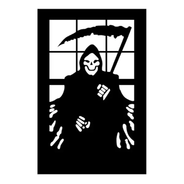 Flot og sjov wallsticker med “Døden” – “Manden med leen” ventende på den anden side af vinduet.