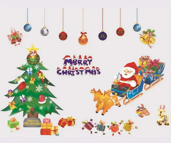 Julemanden i sin slæde med rensdyr foran, juletræ, julekugler og julegaver mm i én stor, flotÂ