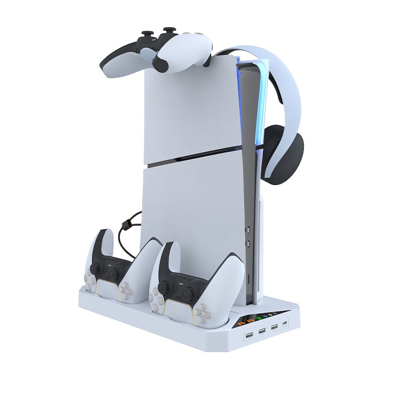 Fed Multifunktionel PS5 Slim Cooling Stand med plads til PS5 controllere samt headphones.
