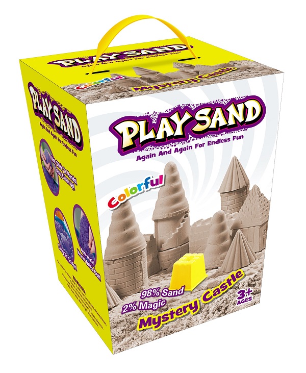 Slip fantasien løs med Play Sand Det mystiske sandslot, et sjovt og kreativt legesæt med 908 g blødt kinetisk sand i fire flotte farver: rød, gul, blå og grøn.