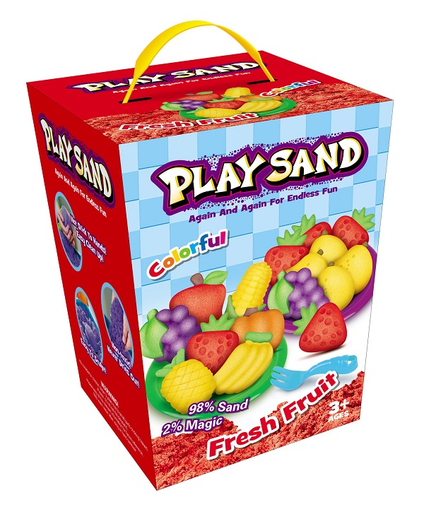 Slip fantasien løs med Play Sand Frisk Frugt, et kreativt og sansestimulerende kinetisk sand sæt med 908 g sand i fire flotte farver: rød, gul, blå og grøn.