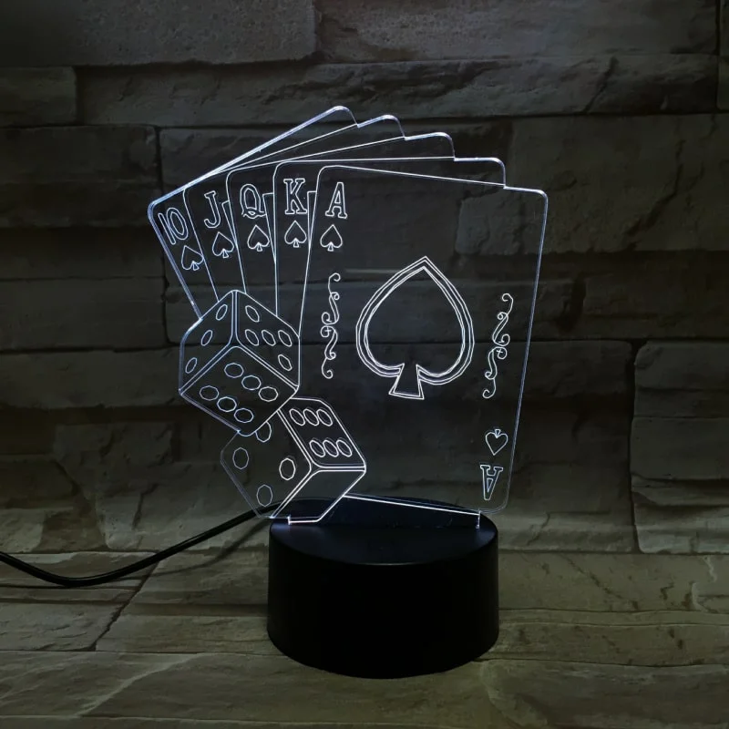 Rigtig flot Poker 3D lampe med spillekort og terninger. Farveskift mellem 7 farver.