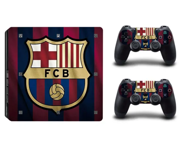 Rigtig flot PS4 Slim sticker med FC Barcelonas logo med en baggrund af deres velkendte røde og blå striber, prydende for- og bagsiden samt siderne på din PlayStation 4 Slim.