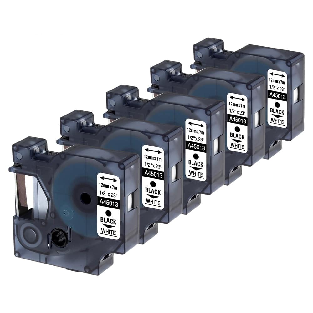 Rabatpakke – 5 stk Dymo 45013 D1 sort på hvid tape Kompatibel S0720530 – 12mm x 7m passer til: Dymo Labelmaker 4500 | Dymo Labelmaker PC 10 | LabelMANAGER 100P | LabelMANAGER 120P | LabelMANAGER 150 | LabelMANAGER 160 | LabelMANAGER 200 | LabelMANAGER 210