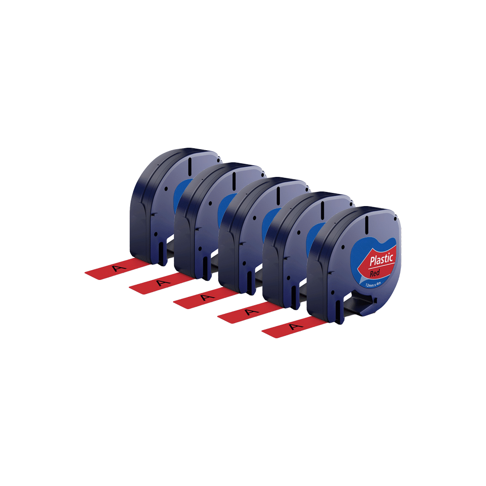 Rabatpakke – 5 stk Dymo 91203 | 91223 sort på rød tape Kompatibel 12 mm x 4 m passer til: Dymo LetraTag 2000 | Dymo LetraTag 200B | Dymo LetraTag LT 100 | Dymo LetraTag QX 50 | Dymo LetraTag XM | Dymo LetraTag XR