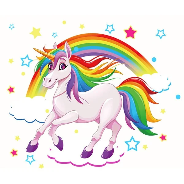 Virkelig flot og farverig Enhjørning Wallsticker med en sød og smilende enhjørning med manke og hale i alle regnbuens farver – ridende foran en regnbue, omgivet af stjerner.