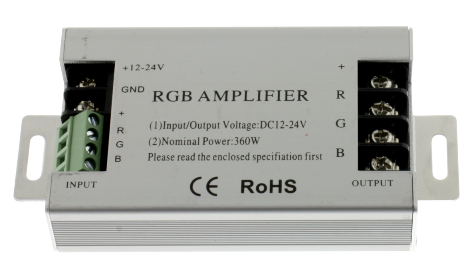 Tilsluttes til udgangen af en controller så der kan styres uendelig mange meter LED lysbånd samtidigt. Flere repeater kan tilsluttes til en controller på samtidigt.