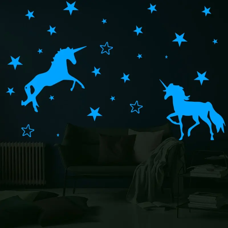 Selvlysende enhjørning wallsticker med to Enhjørninger og 29 stjerner. Blå.