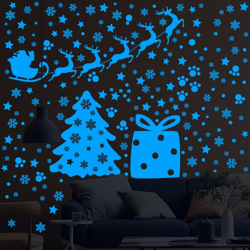 Selvlysende jule wallsticker med julemand, rensdyr, juletræ, sne, stjerner mm.