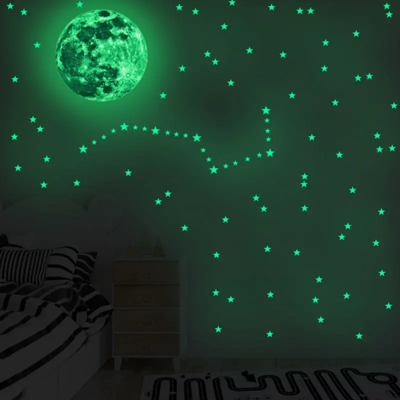 Selvlysende wallsticker med 166 stjerner og en stor flot fuldmåne.