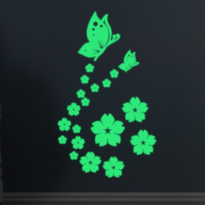 Selvlysende wallsticker med elegante selvlysende sommerfugle og flotte selvlysende blomster.
