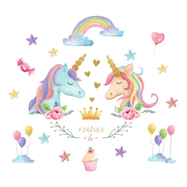 Virkelig sød og farverig Enhjørning Wallsticker med to forelskede Enhjørninger med masser af stjerner, balloner, hjerter mm.