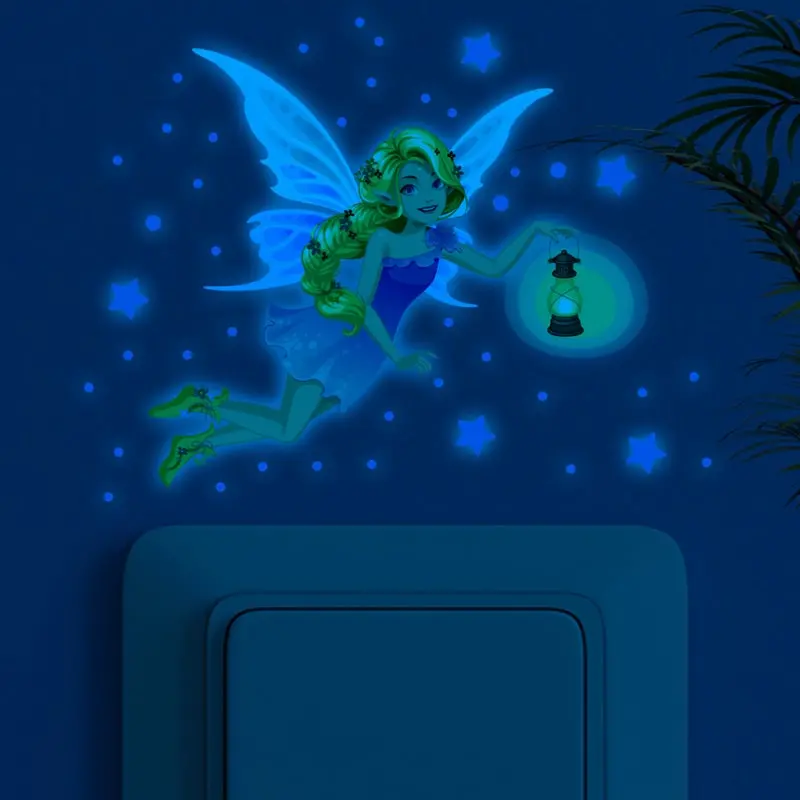 Sød lille selvlysende wallsticker med en flyvende fe omgivet af stjerner. Blå