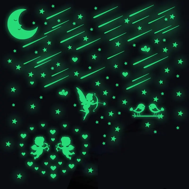 Sød selvlysende wallsticker med engle, hjerter, Amors pil og masser af stjerner.