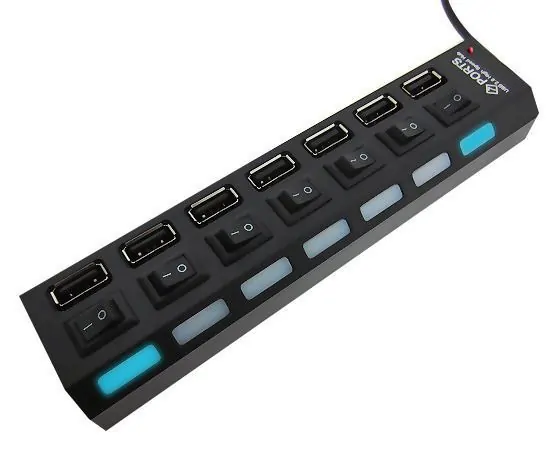 Sort 7-Ports USB 2.0 Hi-Speed Hub. Med On/Off knapper.