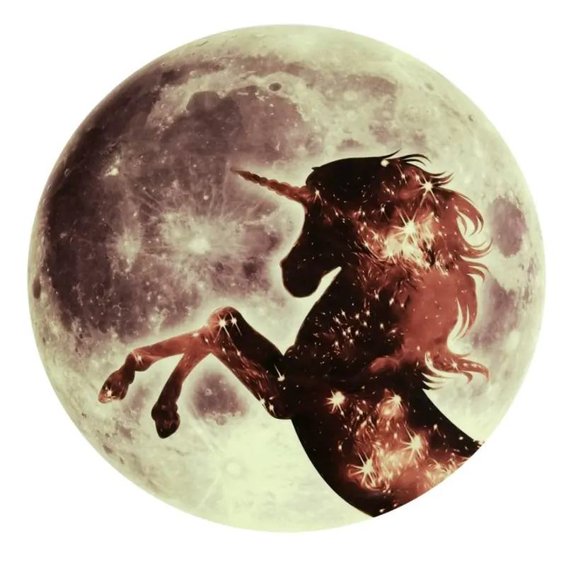 Stor selvlysende måne wallsticker. 30 cm. Stejlende Enhjørning.