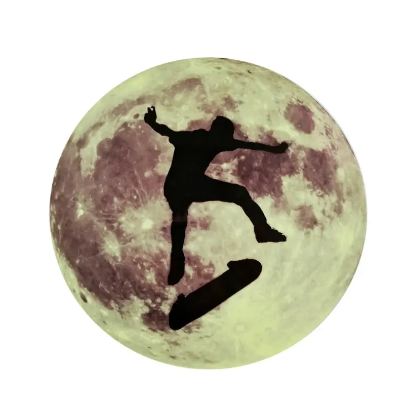 Stor selvlysende måne wallsticker. 30 cm. Tricks på skateboard.