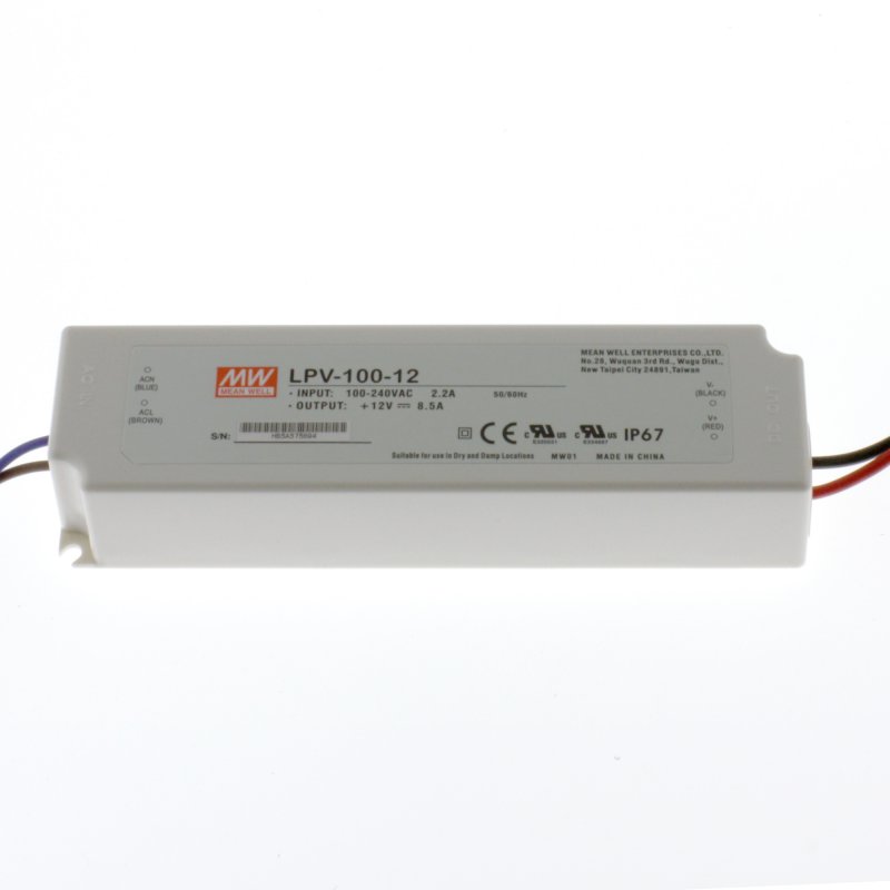 Meanwell, kvalitetsstrømforsyning der er kortslutnings-, overbelastnings- og overspændingssikret.