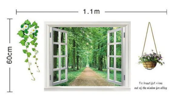 Meget dekorativ wallsticker som er dekoreret som et vindue med skoven som baggrund – på hele 110x60cm.