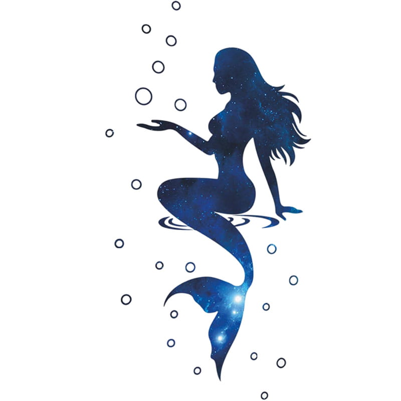 Giv børneværelset et helt unikt og eventyrligt udtryk med denne smukke wallsticker med en stor havfrue i blå med galakse-look.