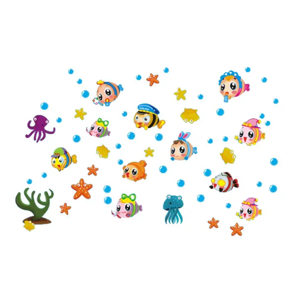 Sjov og sød wallsticker med tegnede udklædte fisk i mange flotte farver.
